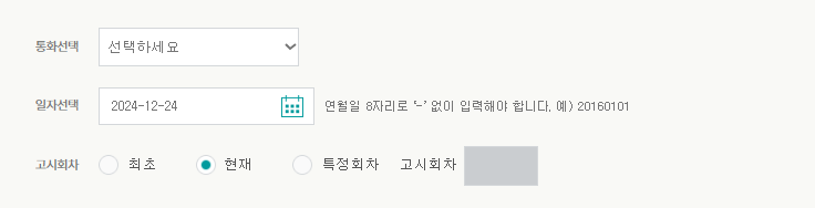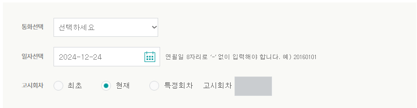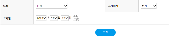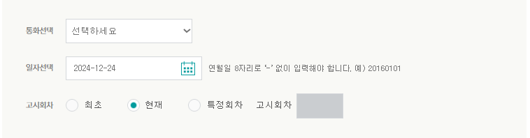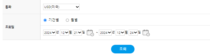 통화를 선택한 후, 일자를 선택하시고 조회를 하시면 됩니다.