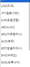 통화 전체 USD(미국) JPY(일본(100)) EUR(유럽연합) AED(U.A.E) ARS(아르헨티나) AUD(호주) BDT(방글라데시) BHD(바레인) BND(브루나이) BRL(브라질) CAD(캐나다) CHF(스위스) CNY(중국) CZK(체코) DKK(덴마크) EGP(이집트