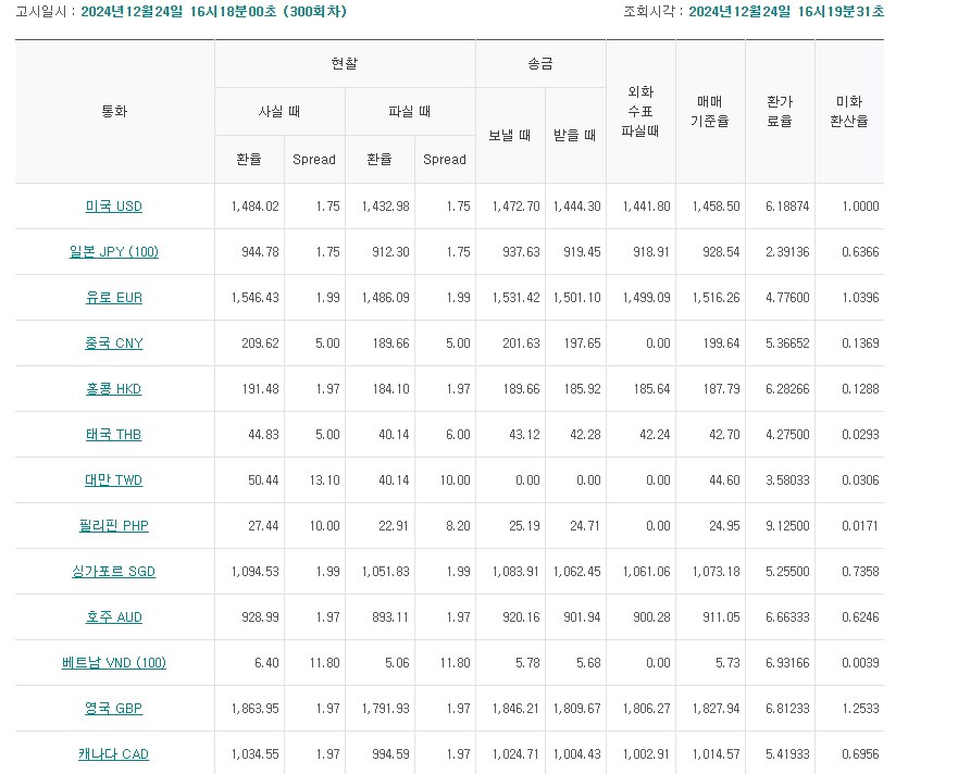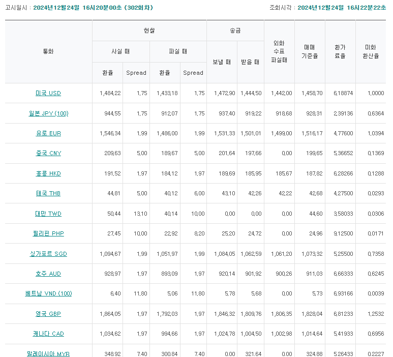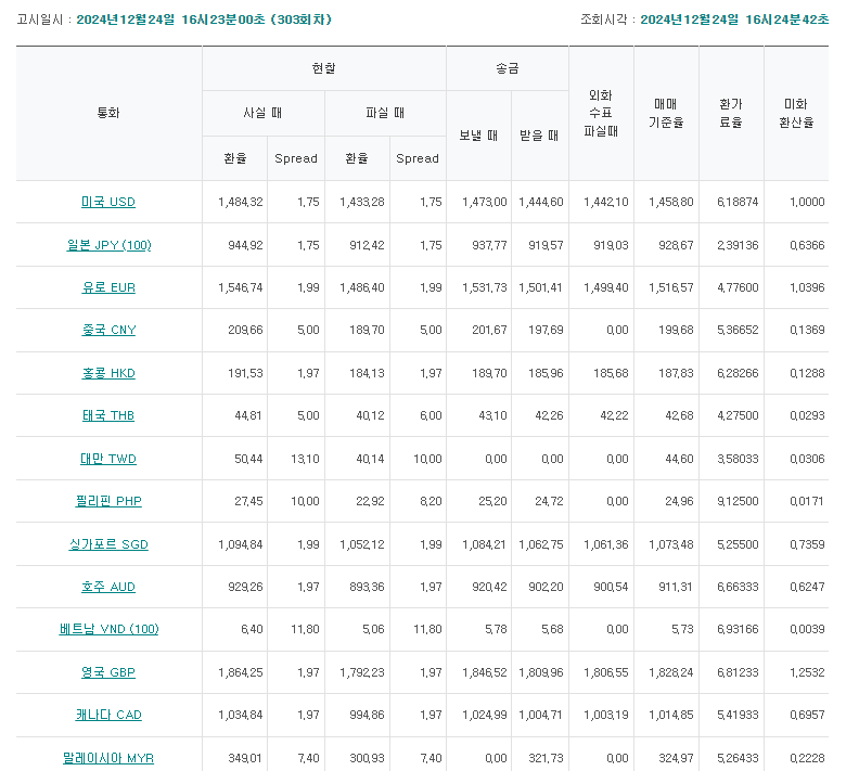 통화 USD(미국) JPY(일본(100)) EUR(유럽연합) AED(U.A.E) ARS(아르헨티나) AUD(호주) BDT(방글라데시) BHD(바레인) BND(브루나이) BRL(브라질) CAD(캐나다) CHF(스위스) CNY(중국) CZK(체코) DKK(덴마크) EGP(이집트) FJD(
